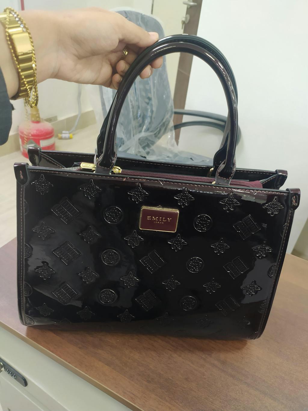 تنفرد الحقيبة بنقوش هندسية وأيقونات بارزة (Embossed) تغطي كامل الهيكل، مع لمسة نهائية لامعة (Glossy) تضفي بريقاً خاصاً وتجعلها قطعة لافتة للأنظار في كل مناسبة.