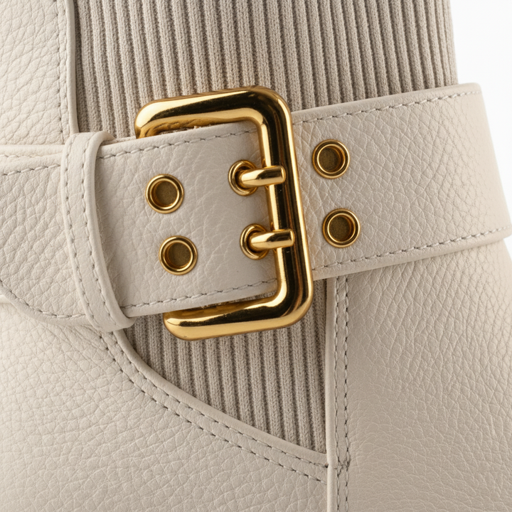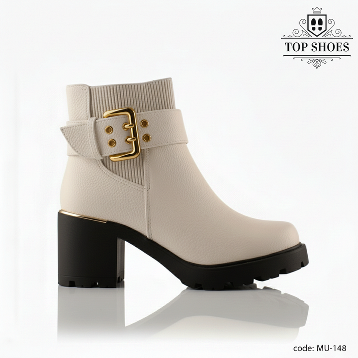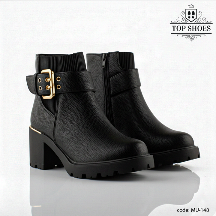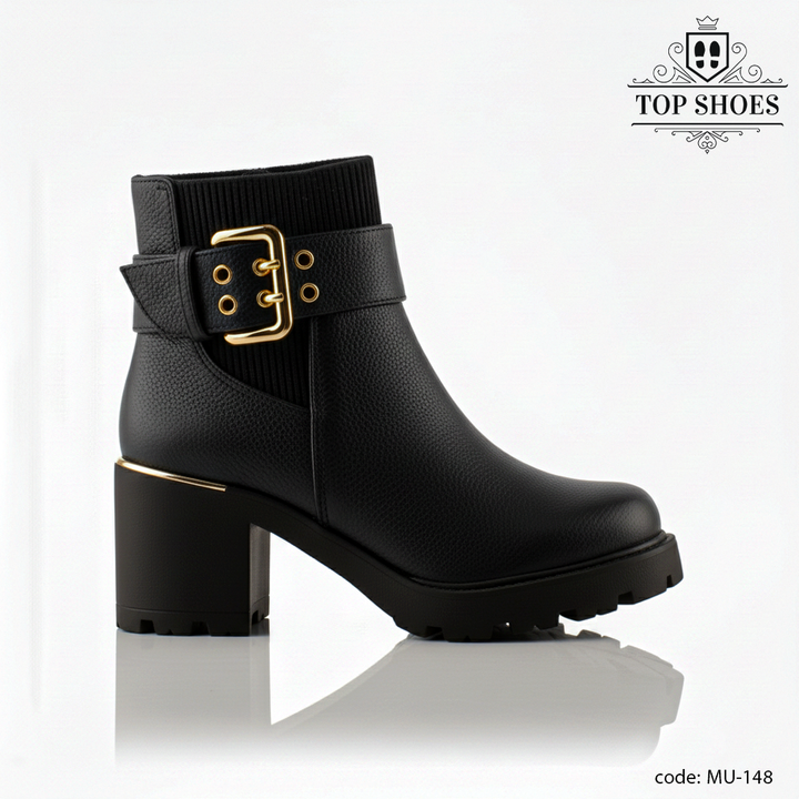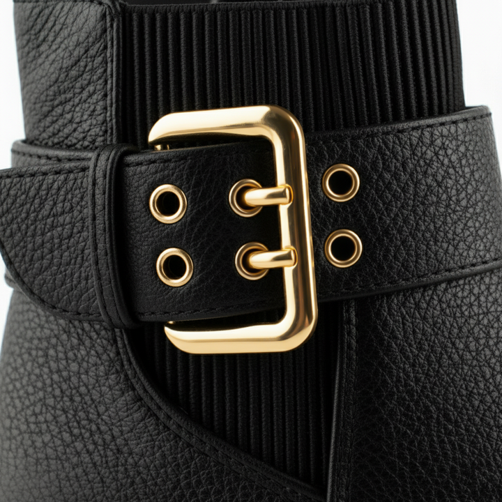 مزود بحزام جانبي مزخرف بإبزيم معدني ذهبي عريض، وكعب سميك مريح يضمن لكِ الثبات والراحة طوال اليوم.